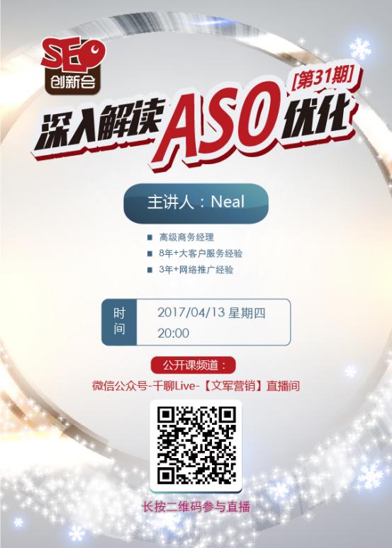 文軍營銷seo創(chuàng)新會第31期帶您深入解讀ASO優(yōu)化,公開課時間為4月13日20:00。