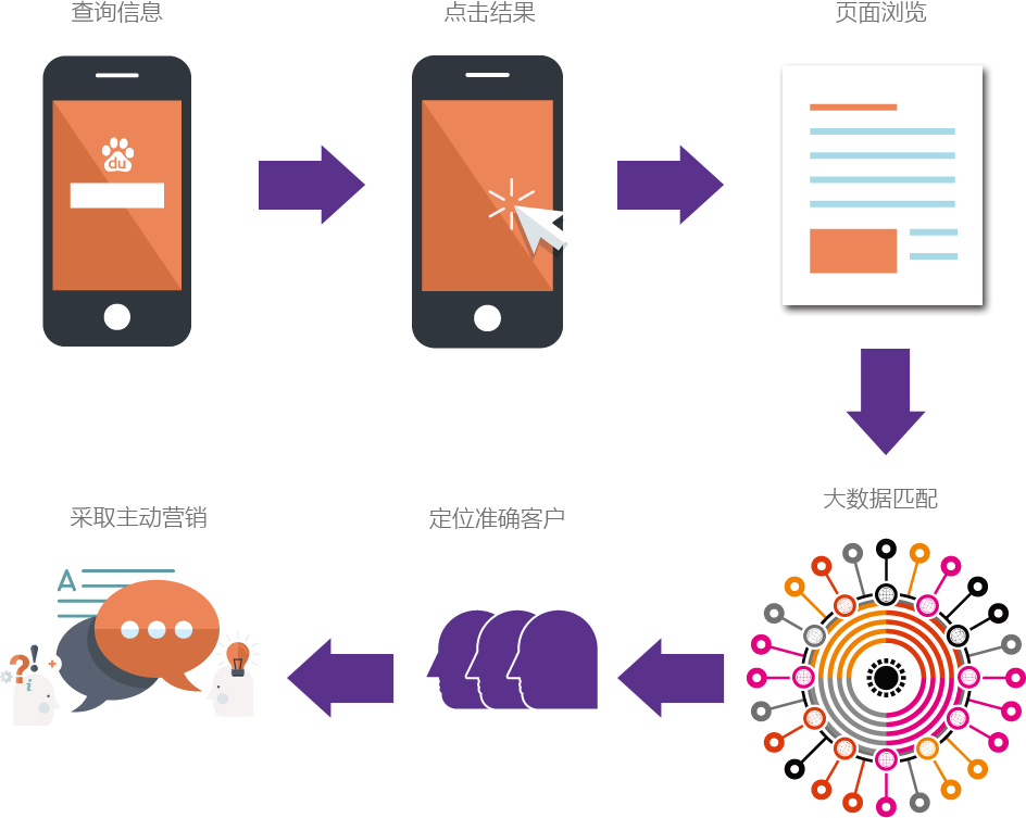 用大數(shù)據(jù)和技術(shù)直接發(fā)掘出搜索者和潛在用戶的關(guān)聯(lián),移動(dòng)端能獲取到搜索者設(shè)備信息,開(kāi)展主動(dòng)營(yíng)銷。
