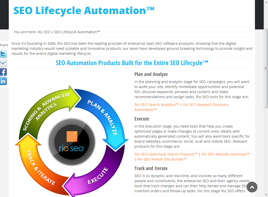 3,www.rioseo.com。rioseo提倡SEO生命周期的自動(dòng)化,提供了關(guān)鍵詞發(fā)現(xiàn),SEO變化趨勢(shì)跟蹤,本地化搜索,站內(nèi)優(yōu)化,手機(jī)站生成,社會(huì)化媒體信息統(tǒng)計(jì)等模塊。