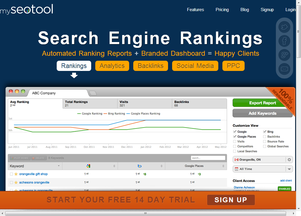 5,www.myseotool.com。它分為很明確的五大模塊:排名,統(tǒng)計(jì),導(dǎo)入鏈接,社會(huì)化媒體,PPC,從這些角度來(lái)進(jìn)行SEO的整合分析。