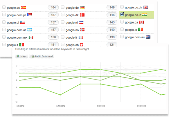 對(duì)于企業(yè)品牌、產(chǎn)品及服務(wù)來說,國(guó)際市場(chǎng)提供了這樣一個(gè)新的機(jī)會(huì),通過Searchlight,你可以達(dá)到實(shí)時(shí)的國(guó)際擴(kuò)展。Searchlight支持超過30個(gè)國(guó)際市場(chǎng)和不同語種,所以你可以方便地監(jiān)測(cè)全球的視角??缭絿?guó)際化搜索引擎,來跟蹤你的搜索引擎性能和排名,以前是從未有過的。通過不同地區(qū)的搜索引擎,創(chuàng)建分類并比較性能,這樣來觀察同樣的關(guān)鍵詞是如何在不同區(qū)域的搜索引擎上展示的。